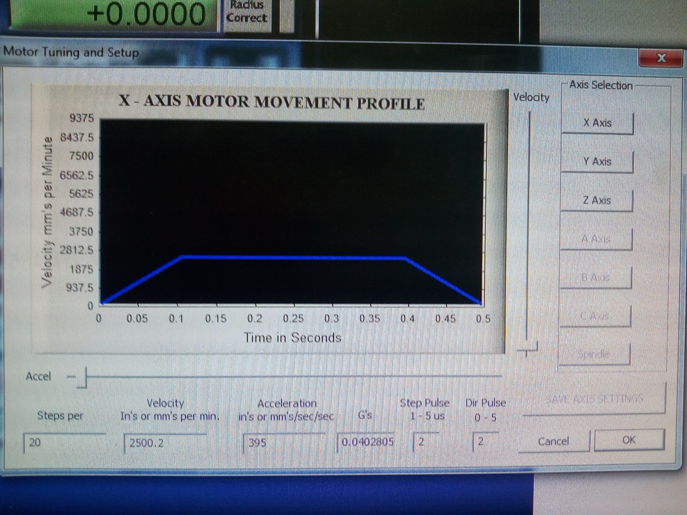 X;Y 20-as golyósorsó 20mm emelkedéssel, Z 15-ös golyósorsó 5mm emelkedéssel. Mind a három orsó egy bekezdésű! Motor felbontás 200, mikró lépés 1/2 Készítettem egy pár képet, sajnos nem valami jó képek de kivehetők az értékek.