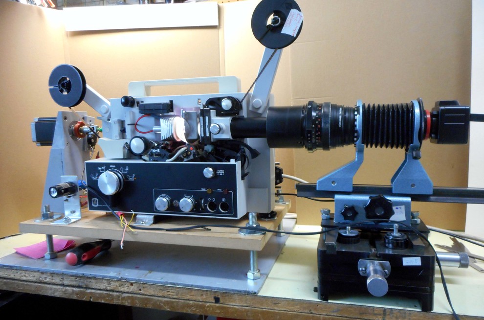 8 mm-es filmdigitalizáló. Ebben az összeállításban kockánként fotózza a filmet, amit egy szoftver összefűz.
