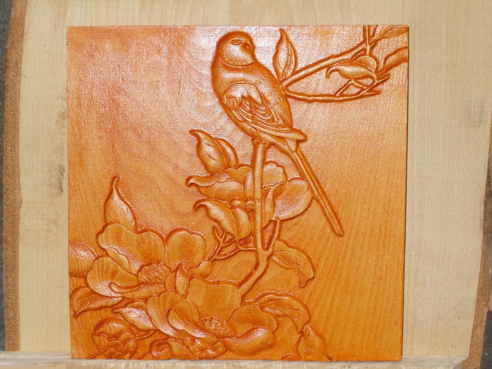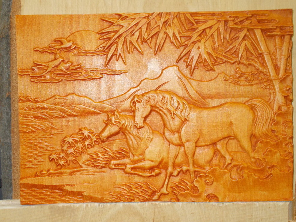 Többnyire fehér bükk,a nagyolást 12mm maróval a simítást 1mm gömvégűvel csinálom.2000mm/min sebességgel 0.34m raszter.Idő egy 25x35cm képnél 2.5-3 óra