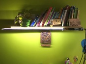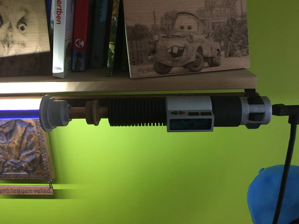 A konzol tegnap pácolva elkészült, a markolat lakkozva, összeállt a kard és ma felkerült a helyére. A táp még nem jött meg, de kipróbáltuk.