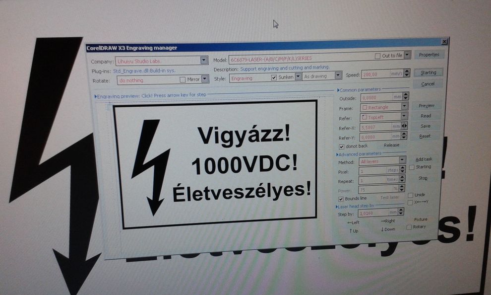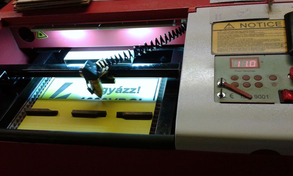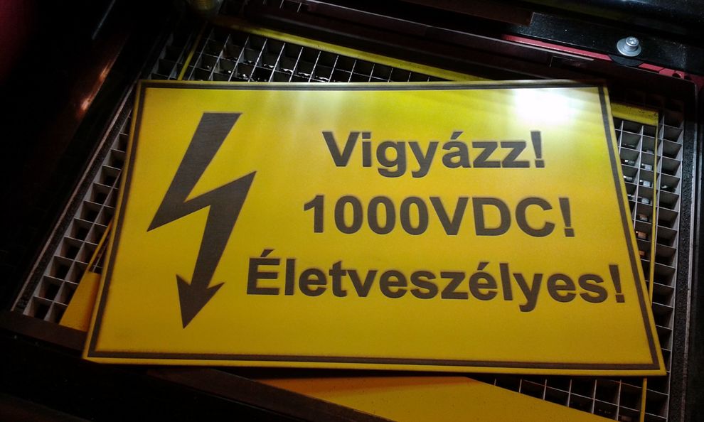 Anyaga, a képen is látható 0,8mm vastag, sárga/fekete UV álló, lézerezhető, felirati táblákhoz gyártott műanyag lemez.