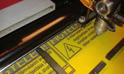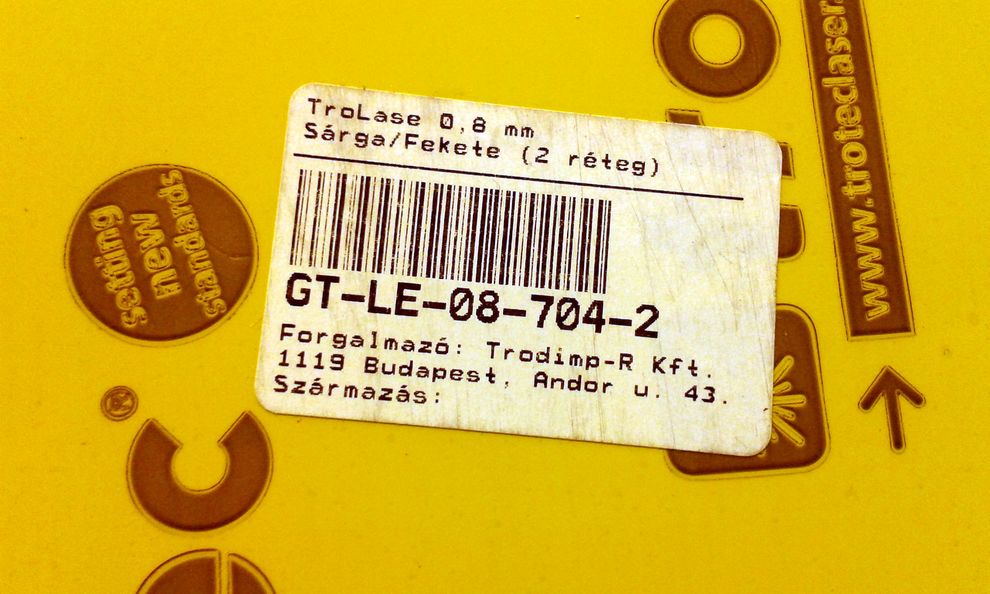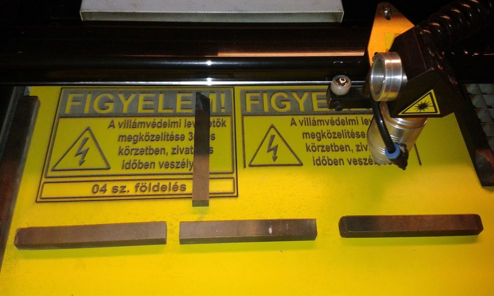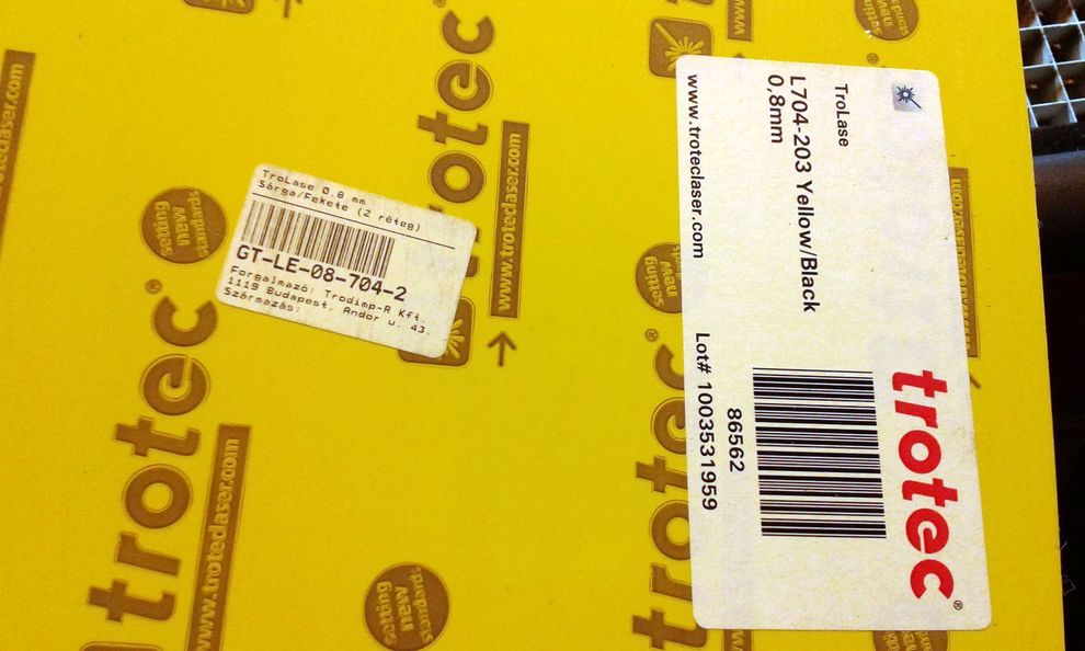 Az alapanyag 0,8mm-es sárga/fekete, kétrétegű, lézerzhető gravírlemez.