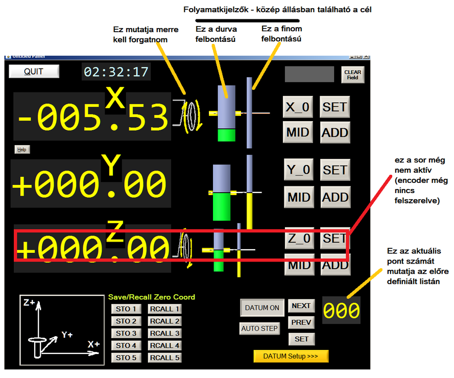 Ugyanúgy működik mint egy bármilyen gyári DRO. A cél eléréséhez mindig addig kell tekerni a kézikereket amíg 0.0 nem lesz.