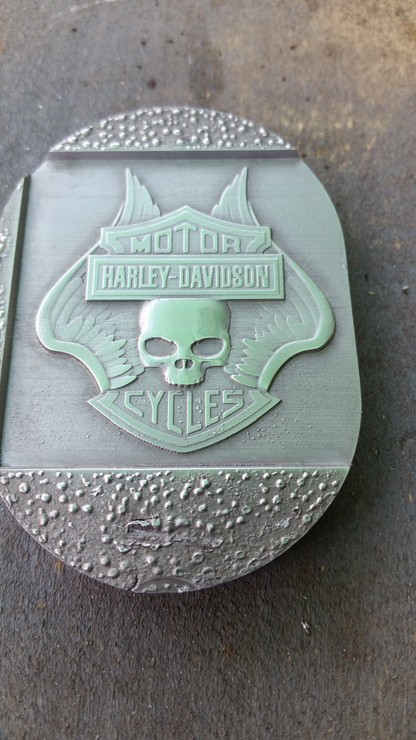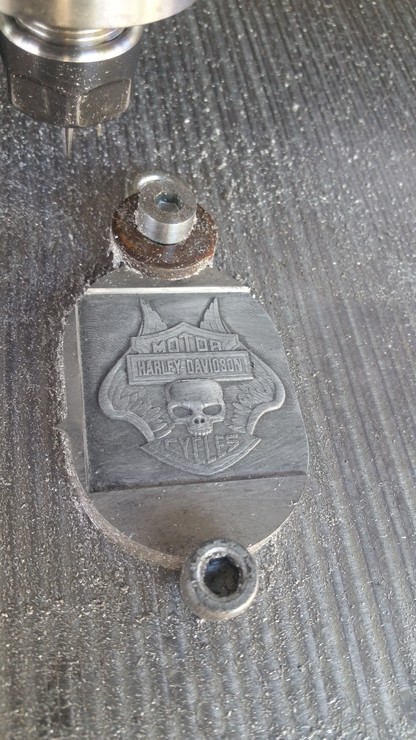 Most hogy van nagobb gépem, kicsi dolgokat csinálok, Sajnos nem volt 0.1-es tűm, ezért ráhegyezten kézbe, egy tőröttre[#nyes] Nem olyan lett mint egy Datron, de legalább befért a betűk közé.3mm magas a Harley felirat, az egész 32x36mm