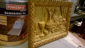Én készítettem ugyan azt a reliefet gőzölt bükkre, tőlgyre illetve akácra is. A felülettel nem volt különösebb gondom, a jó éles szerszám el bírt a fával, de a felület kezelése illetve a kész munka színe, megjelenése, kikészítése sokkal nehezebb volt az akác esetében. fakó sárga az alapszíne.