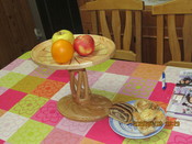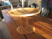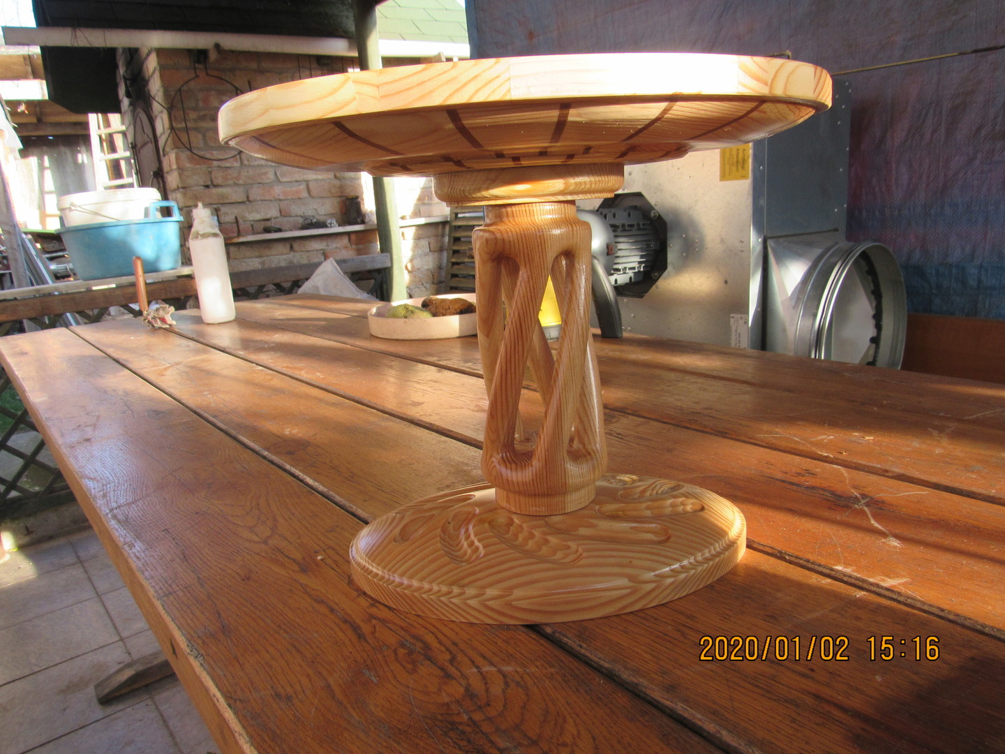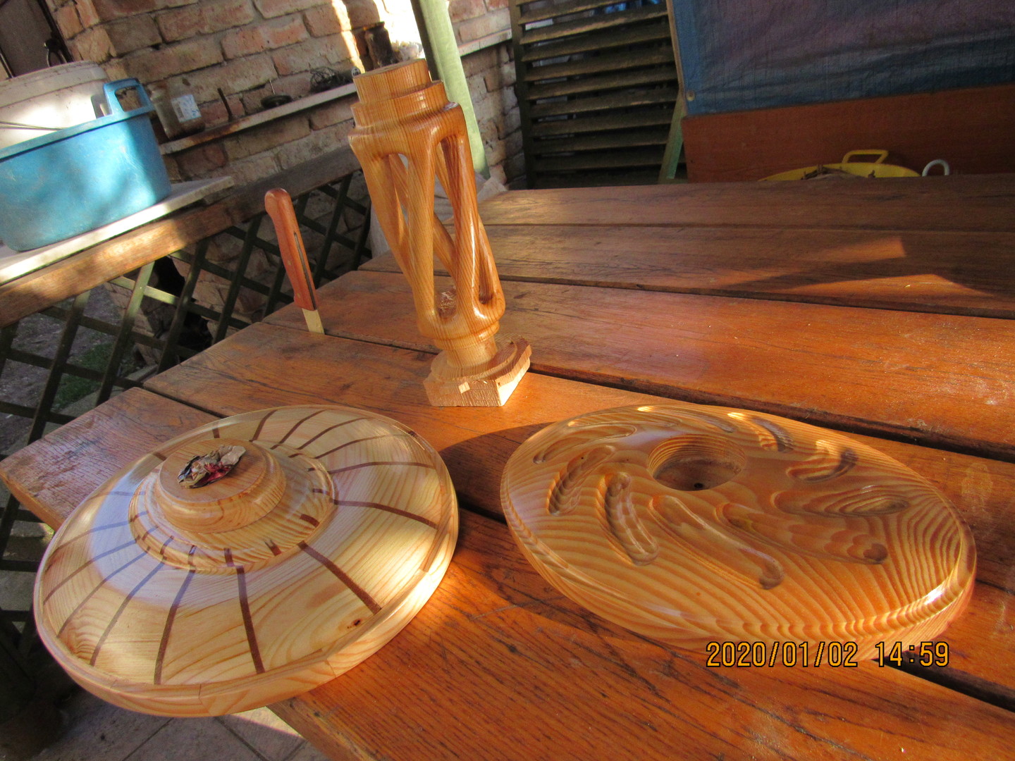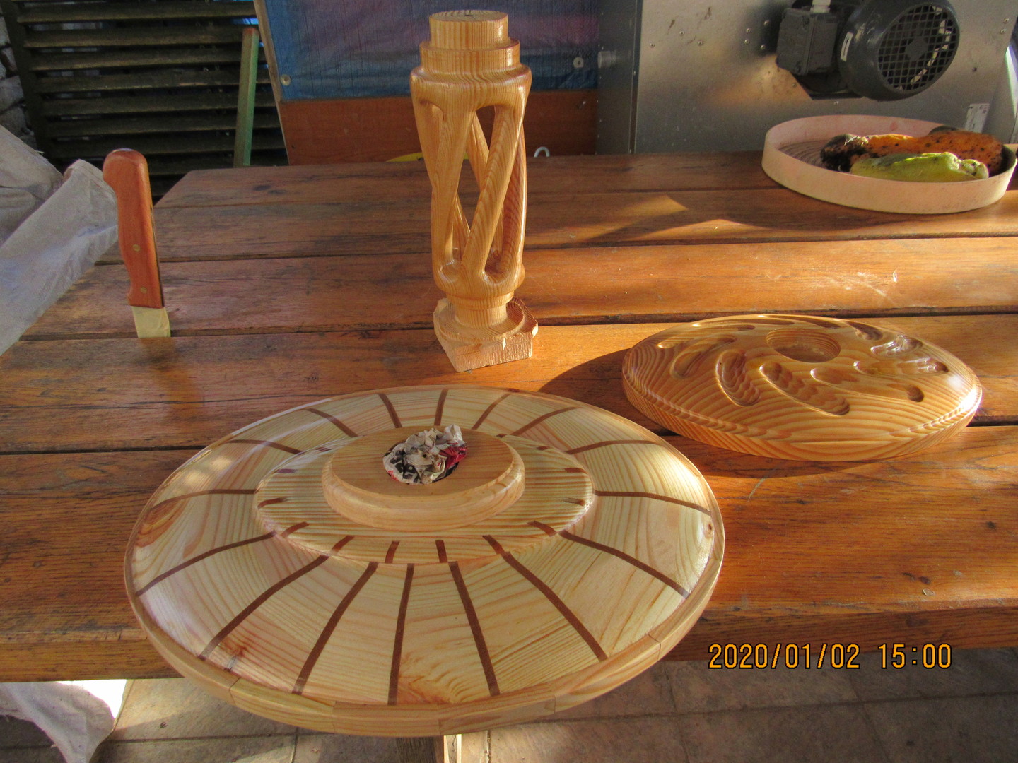 A tányér része apró cikkelyekből van összeragasztva, 3 rétegben, közte sötét fa csíkokkal, aztán két oldalról külön külön marva 12-es gömbvégűvel.
