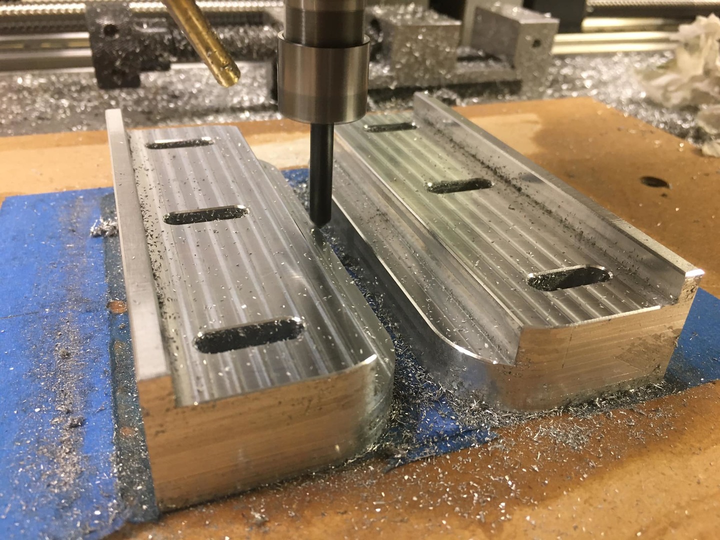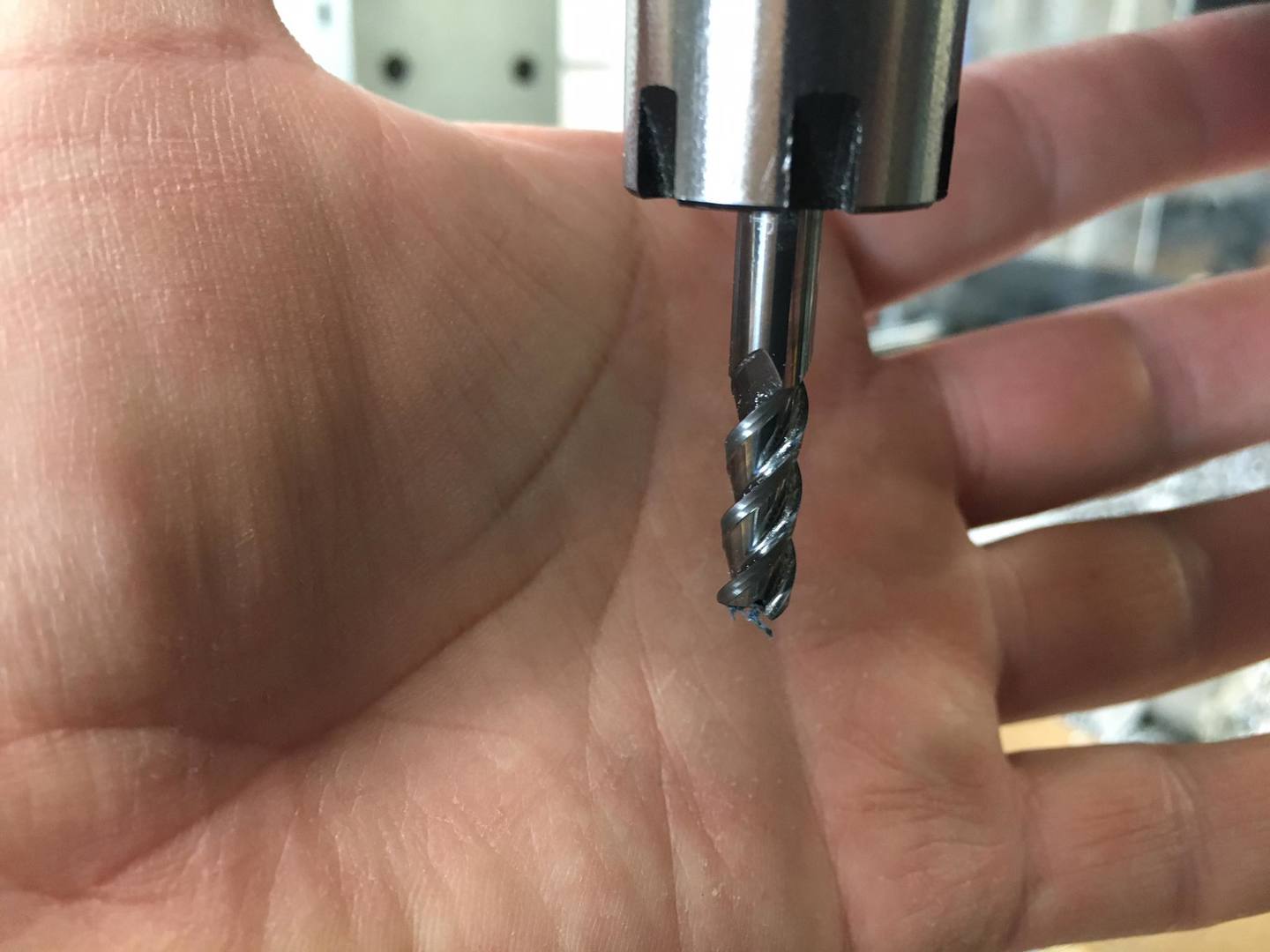 Először egy HSS 2 élű, 8mm átmérőjű, 38mm-es munkahosszal rendelkező maróval álltam neki, de annyira rezonált, hogy inkább átváltottam egy polírozott keményfém maróra, 6mm átmérőben, de csak 18mm-es munkahosszban.