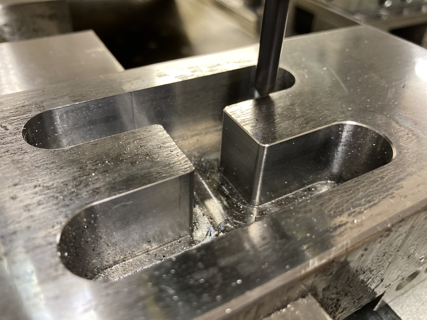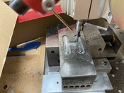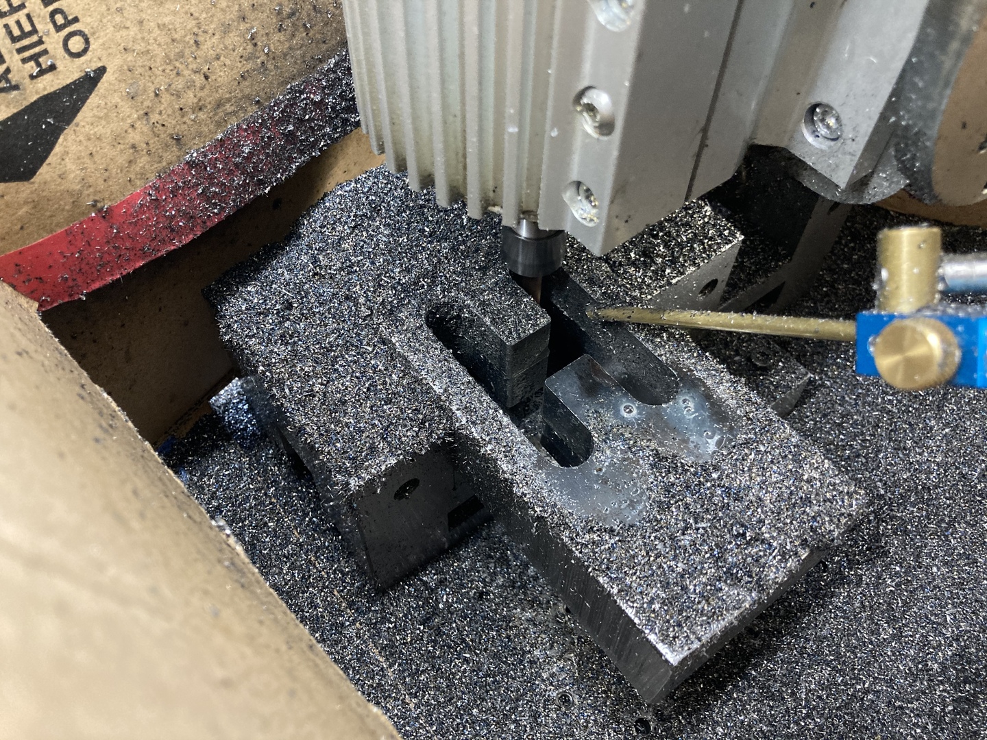 Fura, ez nem marógép?? Azon lehet síkba marni is! :)) Nagy felület? Ez a jó tenyérnyi munkadarab,szinte elveszlik a gépen. Első művelet, a bázisfelület kialakítása... A fűrészpor jellegű forgácsot látva, gondolom kis fogásmélység lassú előtolás kombóval készült. Amennyiben gyenge a gép mondjuk egy 10-es maróhoz, sokat lendíthet ilyen esetben a munkán ha előtte 8mm fúróval végigfúrva a nyomvonalat közel egymáshoz, majd a 10-essel végigsöpörni. Így sem lesz gyors, de legalább kíméli a gépet.