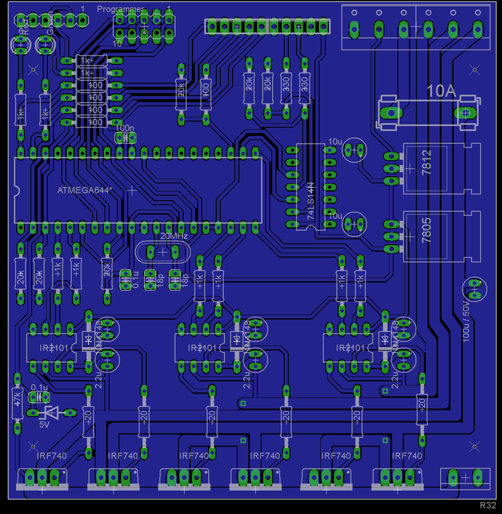 Most épitettem meg, de valamiért nem jó, a .hex fájlt töltöttem be a kontrollerbe debnem azt csinálja mint kéne, pl egyszerre kapcsolja be a felsö alsó fet eket de azt is csak két fázison a 3. on már az sem megy, a konfiguráló programmal nem jól kommunikál. Nem tudom én rontottam e el valamit vagy direkt hiba van beletéve még majd kutakodok mi lehet.
