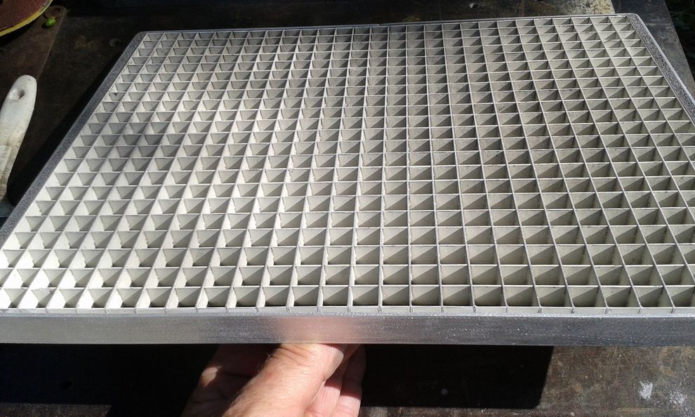 A keret alja,(az elszívást elősegítendő)perforált, szintén alu lemez. A lemez, ragasztva a keretre.