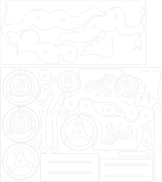 A makett összeállítása egyszerű. Eredetileg a csaprudak "szárazon tartják össze, én biztos ami biztos össze is ragasztottam aminek egyben kéne lenni. Mivel a csaprudaim nem voltak tökéletesek, a "fix" lukakat meghagytam amekkorára a lézer vágta, a "mozgó" lukakat felfúrtam 4.1 mm-re. Így nem szorul sehol sem. A szárnyak "zsanérozása" ideiglenesen egy darab fehér textil szalaggal (koptatóval) történt, idővel jó lenne valami kulturáltabbra cserélni. (Ahogy magamat ismerem, sosem fog megtörténni.) Ami hamar kiderült (eredetileg 3 mm-es rétegelt lemezre lett kitalálva a "mű"), hogy a 2 milis lemez gyenge hozzá. A fogaskerekek minimum 2 rétegből állnak, így masszívak, de a két oldal-lemez ami az egészet összetartja nyeklik-nyaklik. Mindegy, egy próbának jó volt. A fogaskerekeket megkentem szappannal, de még így is szorulnak egy kicsit. A videón meghagytam az eredeti hangot, hogy élvezhessétek a nyöszörgést. [#nevetes1]