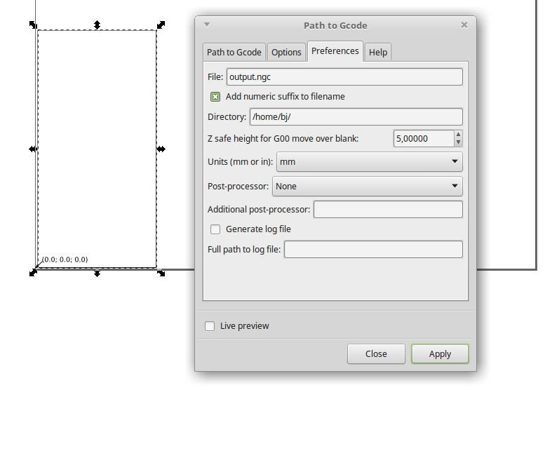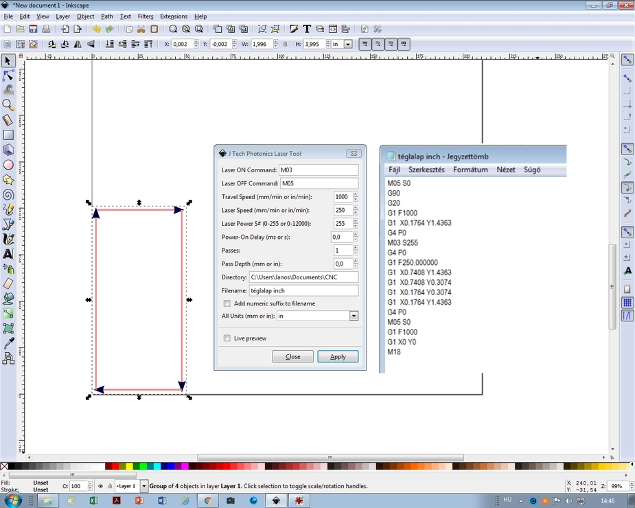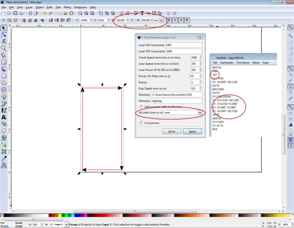 Nekem az a bajom az Inkscape + J Tech pluginnel, hogy a generált g code más méretű mint a rajz pedig mindenhol mm van beállítva. Még nem jöttem rá, hogy miért.
