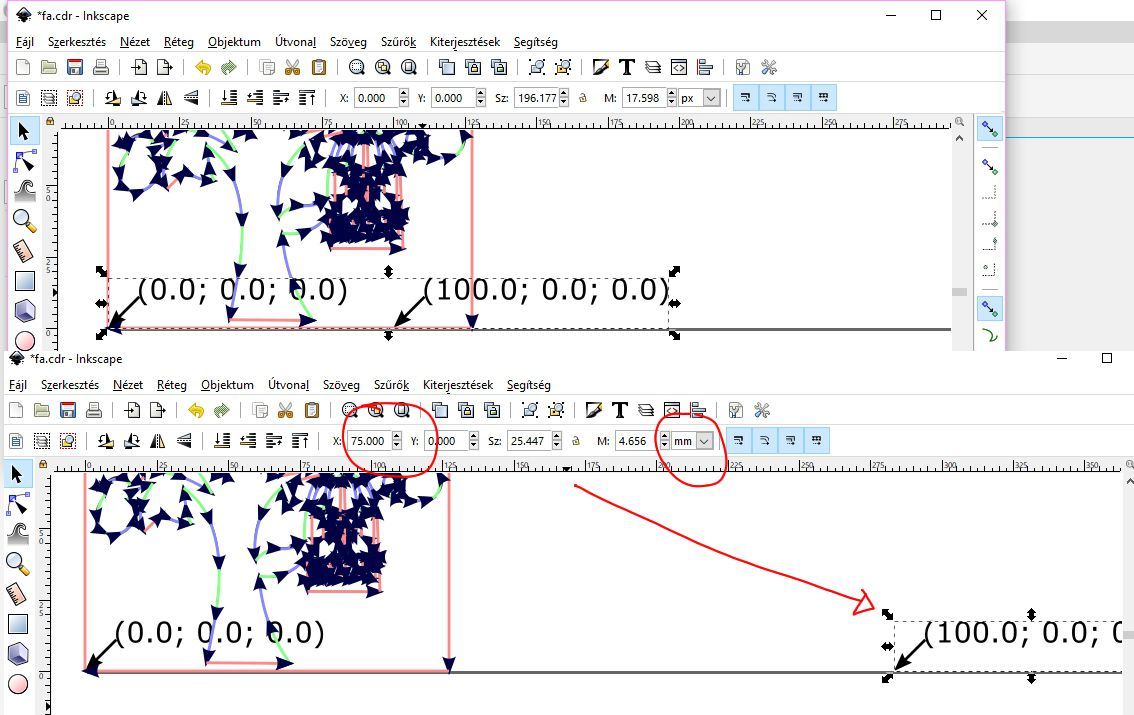 Ha egyszer rákattintok akkor ez kijelölésre kerül (felsőkép), utána a ,,100"-ra kattintasz háromszor (nem túl gyorsan, nem túl lassan) ekkor ketté objektummá válik a (0.0;0.0;0.0) és a (100.0;0.0;0.0) így a 100-ast át tudod helyezni a tényleges 100mm-re.