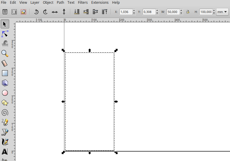 Most a példa kedvéért inkscape-ben rajzoltam egy 50 x 100 mm-es téglalapot. Méretek mm-ben, mint a fejlécen látható. A plugin-ben is mm van megadva mértékegységként. A képernyő fotóra rámásoltam a generált g kódot. Az elején ott dízseleg a "G21", tehát mm-ben vannak a méretek. A koordináták viszont egy 14 x 28 mm(?)-es téglalapot mutatnak. Ez 1:3,57 arány, ami nem igazán hasonlít az inch-re. [#falbav]