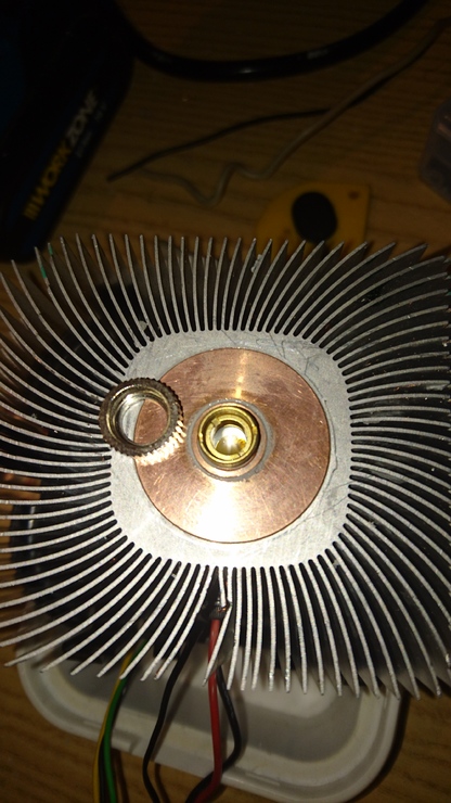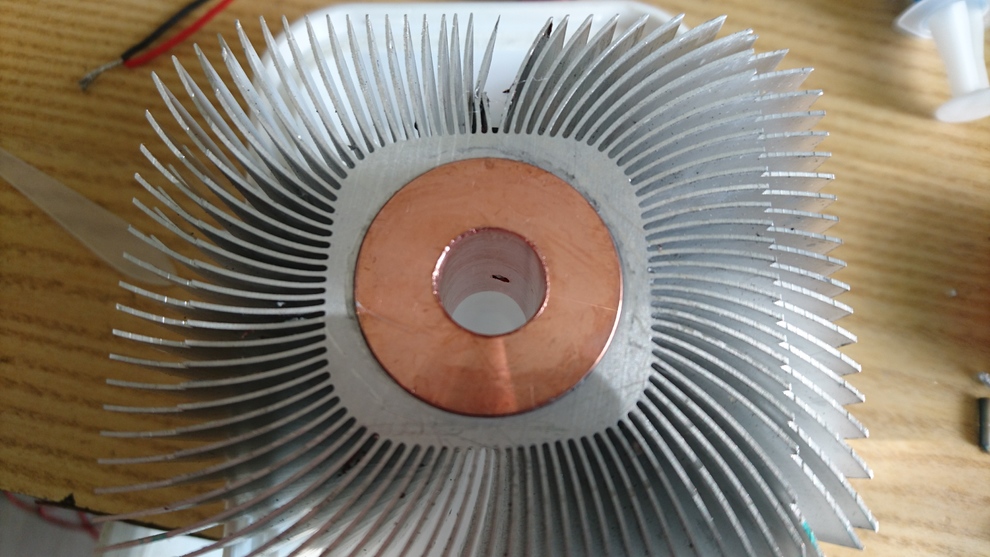 Hűtőnek szintén Cree ajánlásával egy tömör réz magos (henger) hűtőt szereztem számtech boltól használtam. Ez lett átfúrva és hűtőpasztával berakva. A rögzítést egy oldalról behajtható csavarral oldottam meg. Az áramgenerátorba a vezetékek  beforrasztása nem épp volt könnyű, borzasztóan kicsi, nem árt ha van egy kis forrasztási gyakorlat!