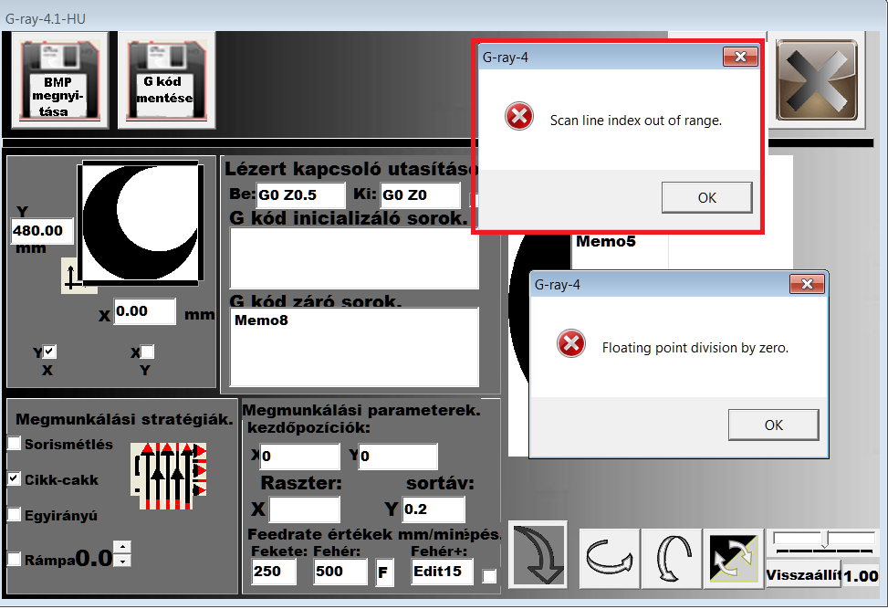 kipróbáltam a programot. Indulásnál hibaüzenet (képen piros keretes) után elindul. Ha betöltök egy képet akkor a másik hibaüzenet fogad, de a kép betöltődik látszólag.