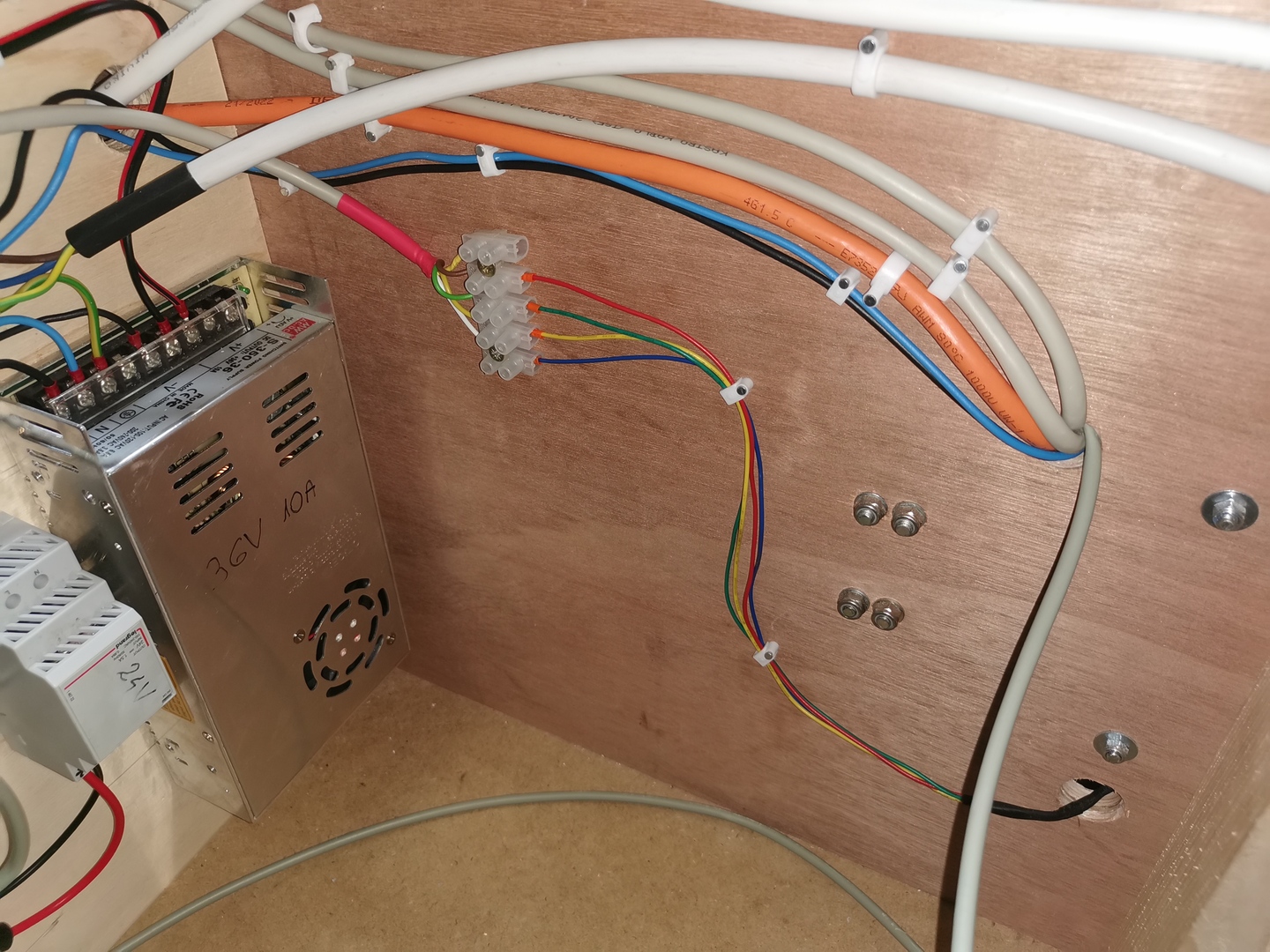 Az egész energialáncot kiszereltem az asztal oldaláról, végig kinyitottam, így a nagy asztalomra felfektetve végre  rendesen bele tudtam rakni marómotor árnyékolt vezetékét, a két léptetőmotor árnyékolt vezetékét, és egy 2 eres árnyékolt vezetéket az y híd láb közepéig fog ez felérni, ott egy sorkapoccsal kötve fogom sorban bekötni az Y és a Z végállás kapcsolóit. Szerencsére az Y lábak belül üregesekre csináltam, így elfér ott majd a sorkapocs is bőségesen.