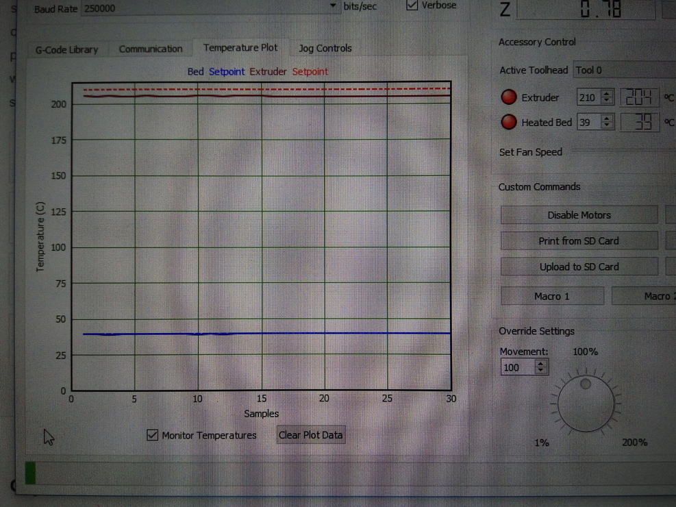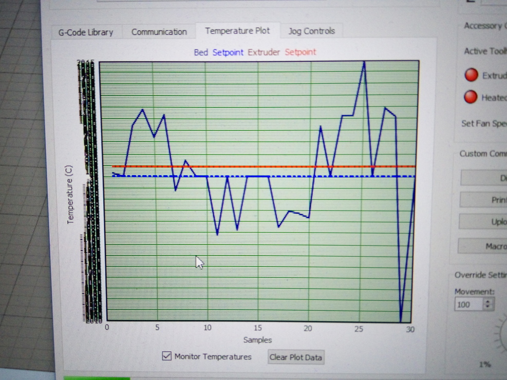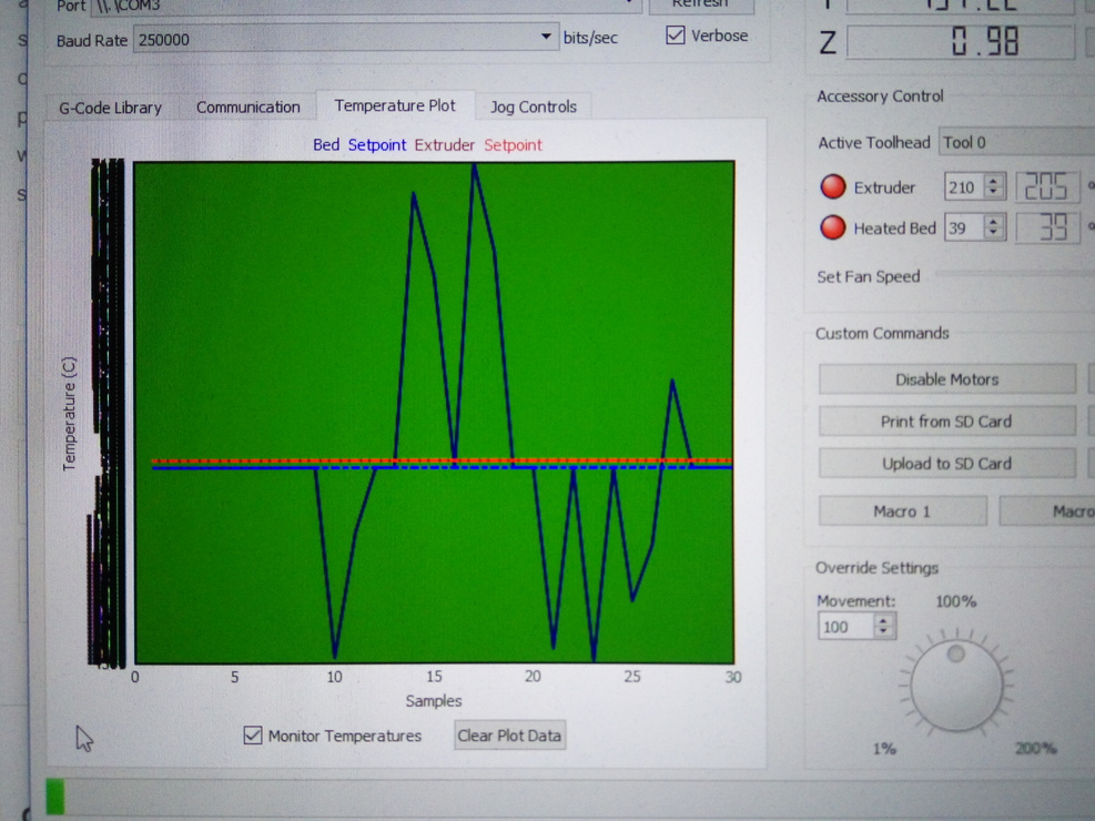 Viszont töredelmesen be kell, hogy valljam, azt hiszem tegnap benéztem, és nem a fej hőmérséklete játszott velem, hanem az asztalé. Nem tudom mennyit számít, hogy melyik adja a fals értékeket a hibakeresés szempontjából, de amikor ma teszteltem a kondis dolgot, akkor döbbentem rá, hogy a bed hőmérséklete az ami ugrál.