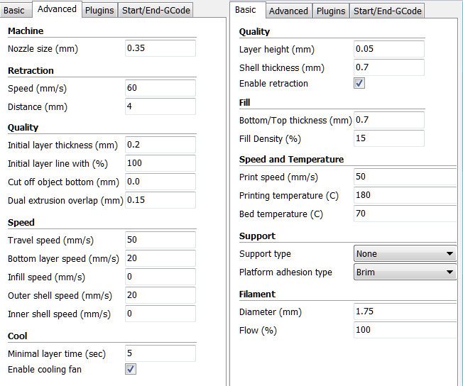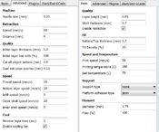 Az alapanyag Devil design PLA, beállítások a képen. A kockánál a sebesség 60, kitöltés 0 volt. Van még mit csinálni a gépen de ez a minőség már tetszik.