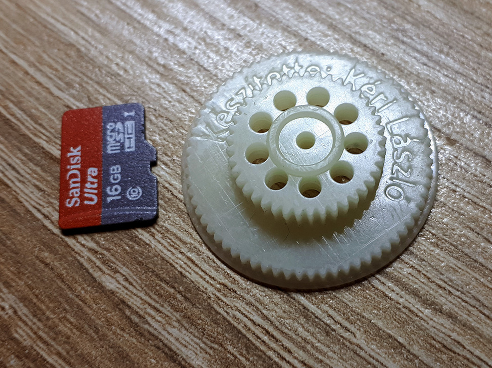 Ez 0.02mm-es réteggel készült, a fogak szélessége 0.628mm (0.4modul), és ez már vagy az 5. próbálkozás, mert ezzel sikerült kitapasztalnom a technológia összes nyűgét.