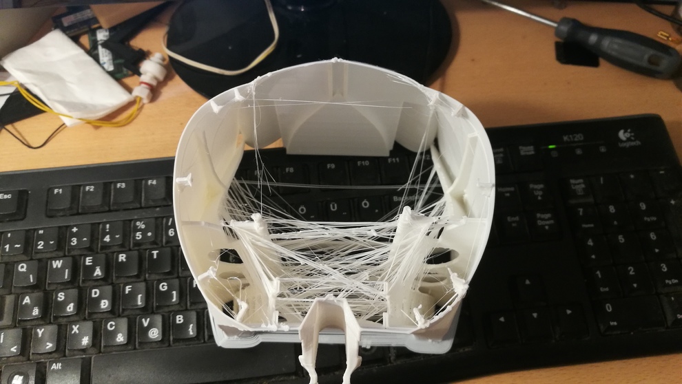 Nekem a legnagyobb bajom most, hogy sokat utazik levegőben a fej és mire a kezdőpontra ér addigra kicsöppen belőle a műanyag. Játszok a hőfokkal és a visszahúzási mértékkel, de minimális kicsöppenés még mindig van. 230 fokról indultam, mert a készítők ezt javasolták, de most 202 fokkal meg és 6 mm-es visszhúzással, anyag PLA. Persze a kicsöppenéssel nem szemol a gép, így azon a részen hiányos volt a darab aminek falvastagsága csak kicsvel vastagabb mint a fúvóka.