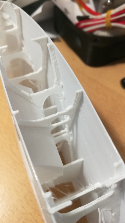 Azért gondolkodtam az átépítésen mert mikor a repülő alkatrészeit nyomtatom, akkor az adagoló úgy jár mint egy varrógép. Az előtte lévő, mágnesesen rögzített szálérzékelő folyton leesik a folyamatos rángatástól. A vásárolt programcsomag Prusa-hoz lett megcsinálva, és annál, csak 0,8mm  mozgások közt a szálvisszahúzás. Nekem meg a bowdeneshez fel kell emelnem 6mm-re. Lehet, hogy a hőfok filament függő , de ott eredetileg 230 fok van beállítva, ezt is le kell vennem 190-re. Mikor a belső bordázatot alakítja ki, többnyire csak odanyom egy kis pöttyöt és már megy is tovább, a szárnyborítás, meg nagyon vékony, csak fúvóka vastagságú, vagyis 0,4mm. A sok szálmozgatástól meg olyan mintha pacázna a gép, mert mert a szárnyborda gyakran kitüremkedik a borításból. De volt olyan, mikor a darab egyik fele sima lett a másik meg kitüremkedett.