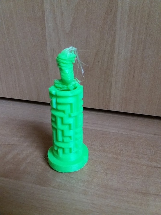 Az élet nem fenékig tejföl! Ezért nem szabad magára hagyni a nyomtatót. A zöld elem másodszorra sikerült csak. Tegnap délután kezdtem neki, és mivel nem szokott gond lenni, ezért tettem-vettem, rá se néztem. Aztán furcsa hangokra lettem figyelmes. Nem tudom miért, de kb. 3/4 magasságnál felvált a torony az asztalról, pedig folyamatosan 60°C volt. Ezután a fej nyomta ugyan a szálat, de nem a helyére, hanem ahogy épp sikerült, laza pórázon maga után rángatva az elszabadult darabot...