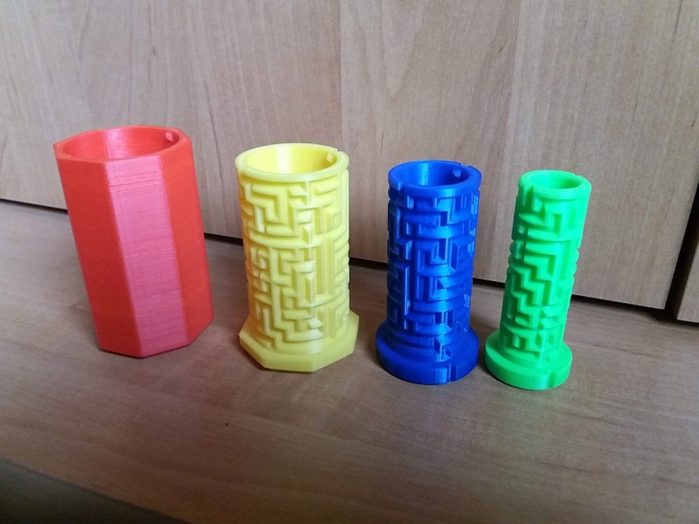 Tegnap és ma ezeket nyomtattam. Egybe "tekerhető" labirintusok. A külső piros tok kb. 10 cm magas.