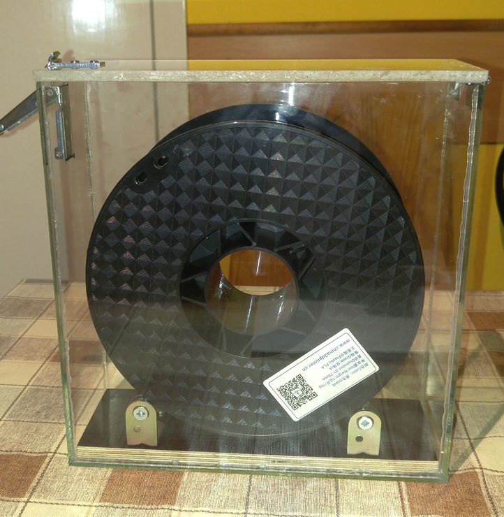 Az én masinám úri helyen, a dolgozószobában lakik. Annyit szoktam megtenni, hogy amikor nem használom, a filament eredeti műanyag zacsiját ráhúzom a dobra. Alul meg betömködöm a spulniba, hogy a párás(?) levegő sem nagyon tudjon hozzáférni a szálhoz. Így talán nem is porosodik, nem is nedvesedik.