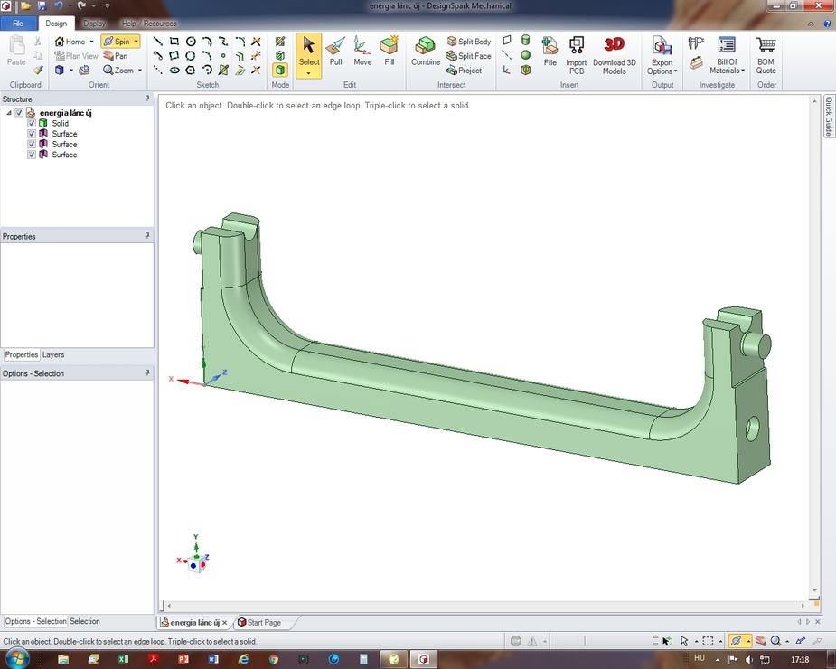 Itt látható az energia lánc alkatrész DesignSpark Mechanical képe és a megvalósult és beépített elem. Most épp tesztelés alatt áll, hogy a PETG mit bír el ipari környezetben. Ez egy kötőgép energialánca, a kábelek kb. 10 mm átmérőjűek.