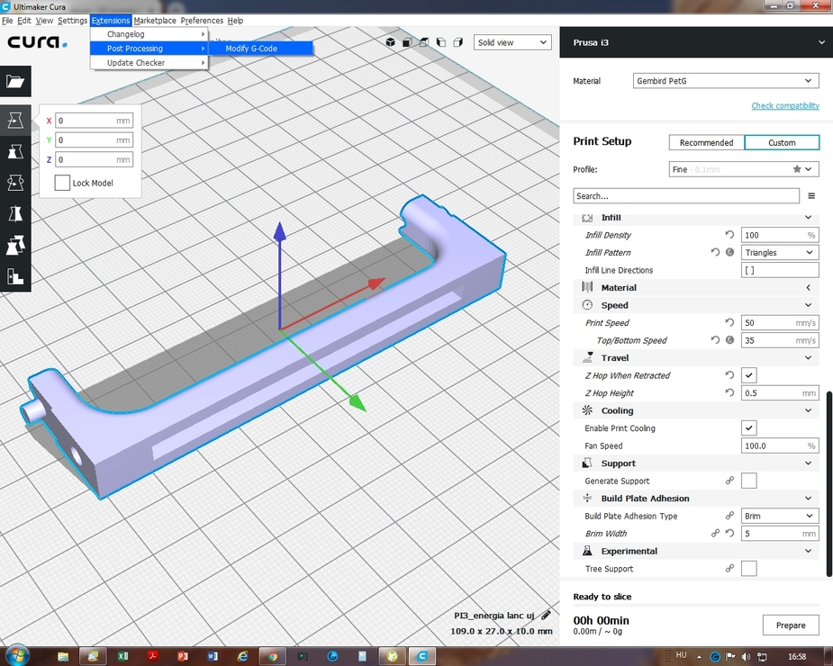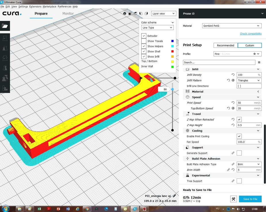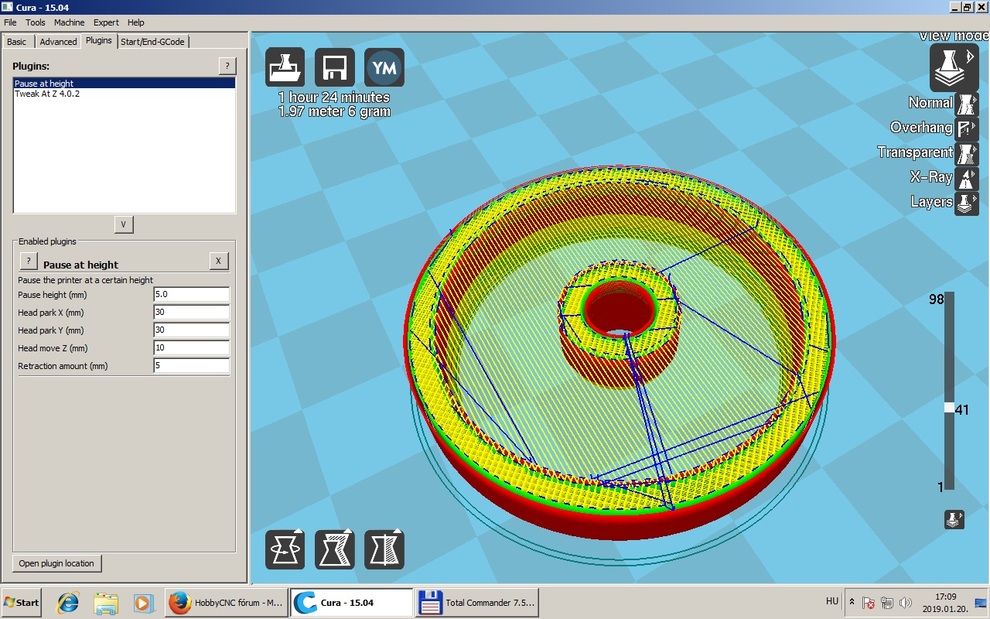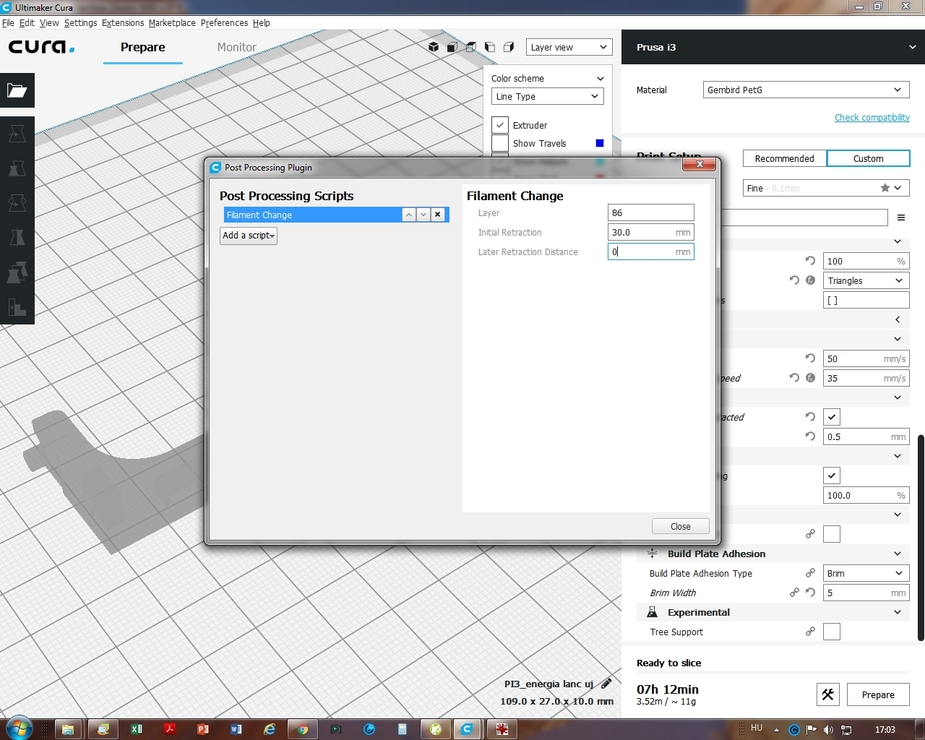 Képregény következik némi szöveggel. Először a Cura-ban bemész az "Extensions"-"Post Processing"-"Modify G-code"-ba (első kép). A felugró ablakban ráböksz az "Add a script" gombra (második kép) és kiválasztod a "Filament change"-t (harmadik kép). A "close"-al bezárod az ablakot, egyenlőre ennyi. Betöltöd és felszeleteled a tárgyat ahogy szeretnéd.  Utána a nézetet "layer"-re állítod és megkeresed hol kell megállni. Ez nálam a 86. réteg (4. kép) mert ott még látszanak a zsebek, a 87. réteg már lefedi őket. Utána ráböksz a "Prepare" (szeletelés) gomb mellett látható "kalapács-villáskulcs" gombra és a felugró "filament change" ablakban beállítod a kívánt rétegszámot ahol meg akarod állítani (nálam 86). Amit még beállíthatsz, az "initial retrack" azt a szálvisszahúzást állítja be, amit a fej még a "home"-olás előtt, a tárgy felett csinál. A "later retraction" a home pozícióban levő visszahúzás, ha tényleg szálat akarsz cserélni. Gyakorlatilag teljesen vissza lehet húzatni a szálat. Én ezt "0"-ra állítottam mert nem cseréltem szálat. Ha ezzel kész vagy, "close"-al zárt be az ablakot és ne felejtsd el újra szeleteltetni a tárgyat most már a tényleges megállás helyével. Ezt a scriptet többször is beszúrhatod egy g-kódba, ha több rétegnél szeretnél valamit ügyködni.