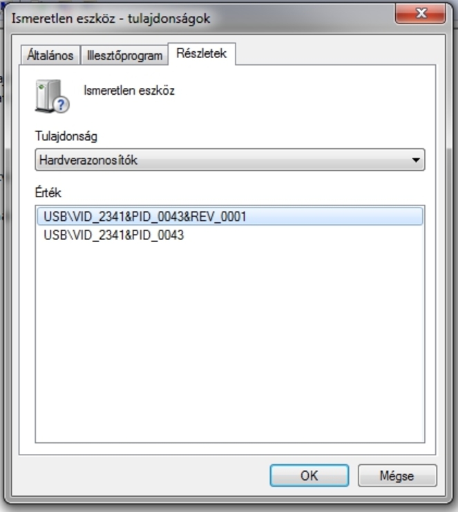 Az eszközkezelőben van egy "ismeretlen" eszköz, arra viszont ezt írja ki: