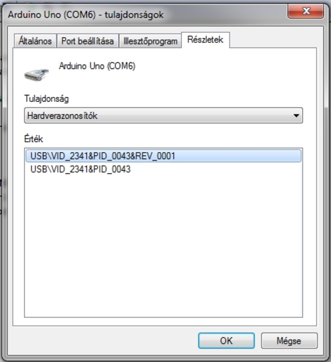 Az eszközkezelőben USB portként kell látszania, ennek a tulajdonságaiban kell megnézni a VID:PID értéket.