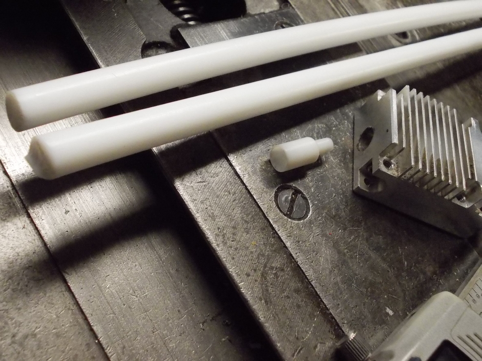 A fúvóka testnek jó a réz, de egy injekciós tűt belesajtolnék a fúvókába, hagynék egy kis kiálló részt és ráhúznék az egészre egy teflon kúpot.