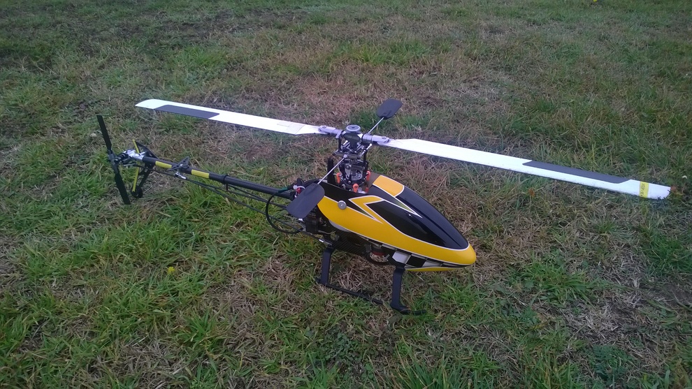 Bár most (tavaly) tuningolni kellett, mert már lustának éreztem. Raktam bele nagyobb teljesítményű motort, 4cellás akkut, kisebb fogaskereket, kijjebb raktam a szervón a gömbcsuklókat, hogy nagyobb rotor állásszöget lehessen állítani, aztán az első tesztnél nem tudta visszahúzni a szervó a kollektívet, és belecsapódott a plafonba.