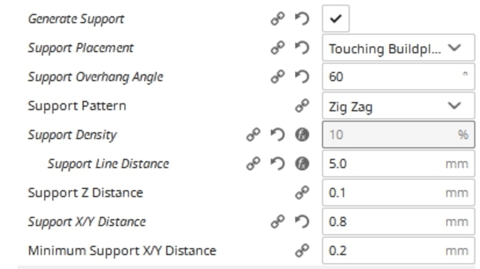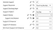 Én a támasz "szöget" 60°-ra vettem fel, és eddig nem volt vele problémám. A "sűrűségét" a tárgytól és a kinyúló rész méretétől függően 10-20% közé szoktam állítani. A szeletelés után (Cura 4.3.0) megnézem, és ha 4-5 mm-nél nem ritkább a támasz akkor elég szokott lenni. Én a "cikk-cakk"-ot részesítem előnyben, mert elég könnyű eltávolítani a többihez képest, legalábbis ez a tapasztalatom.