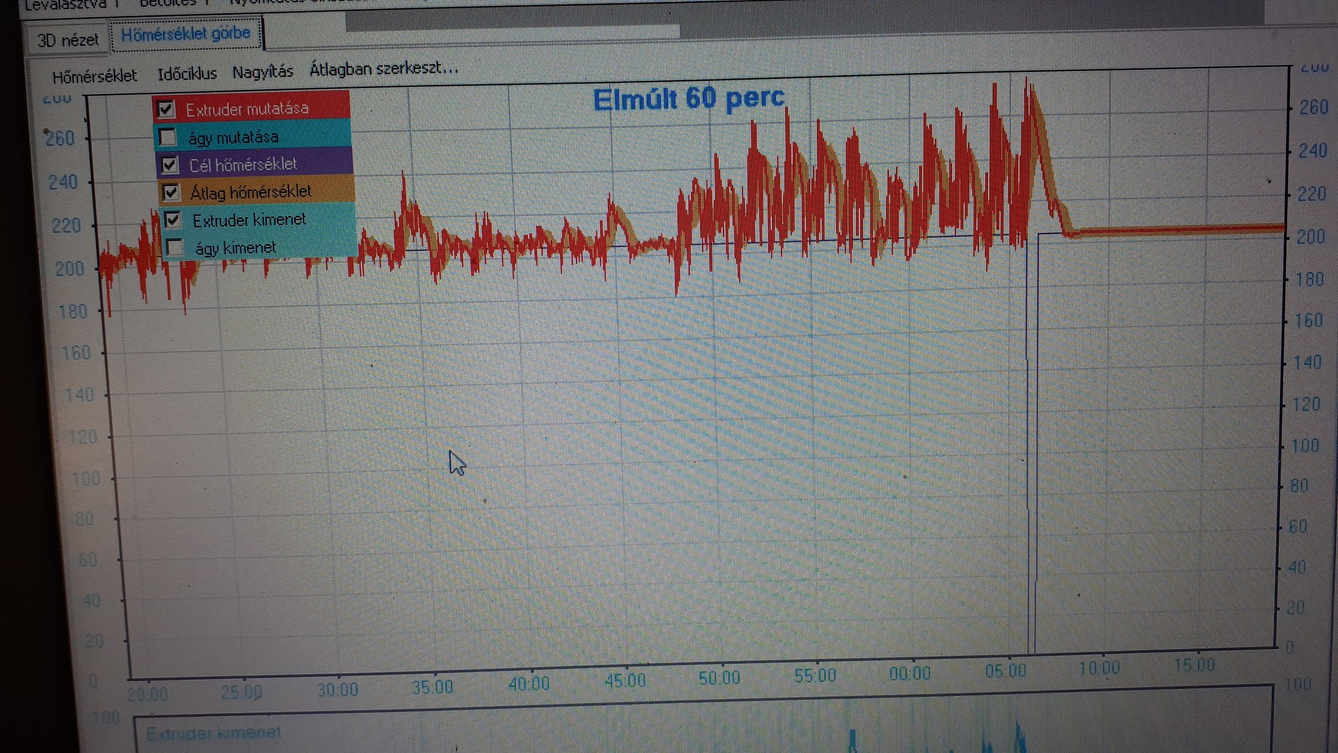 Érdekes módon ha nincs közben olyan mérvű túllendülés, hogy letiltson, egy idő után megszűnnek a kilengések és visszaáll az extruder hőfok a beállított értékre...végig is megy a nyomtatás.(4. kép)
