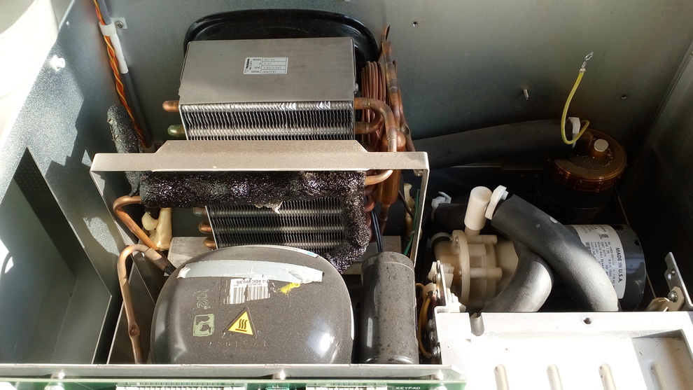 Egy biztos nagyon jópofa kompresszoros hűtő van benne ami az átfolyó folyadékot hűti és még külön keringető szivattyúja is van.