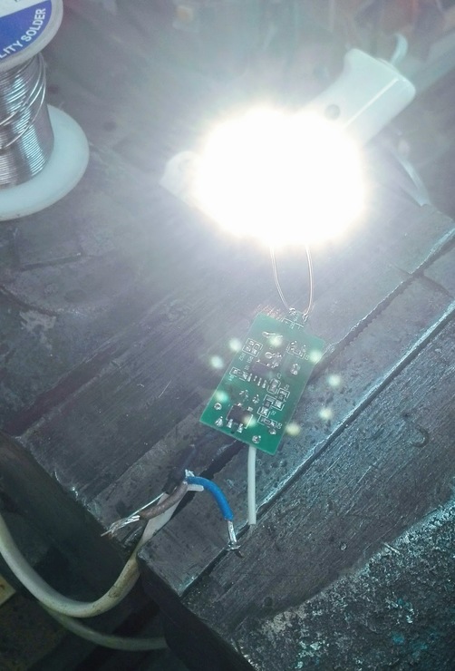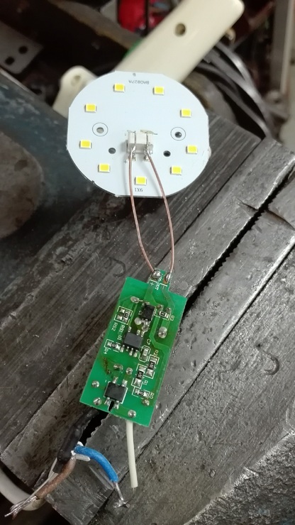 Visszaforrasztva (pisztolypákával) majd lengőszereléssel összehuzalozva, valami bődületes mennyiségű vakító fényt kezdett sugározni, mintha hegesztenének.
