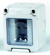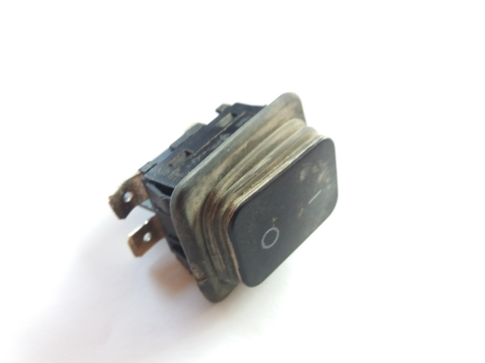 Vízmentes ipari kivitel kéne ami 230V/10A-t tud tartósan. Az átlátszó PVC kupakos nem jó, mert télen hidegben úgy megkeményedik, hogy nem lehet kapcsolni. Ez az eredeti gyári darab, ami 6 év után feladta, elégett az egyik kapcsoló pogácsája. Ennek gumi harmonikás a vízszigetelése, de sajnos rá van sütve a kapcsoló billenő részére, nem lehet más kapcsolóra átrakni.