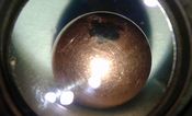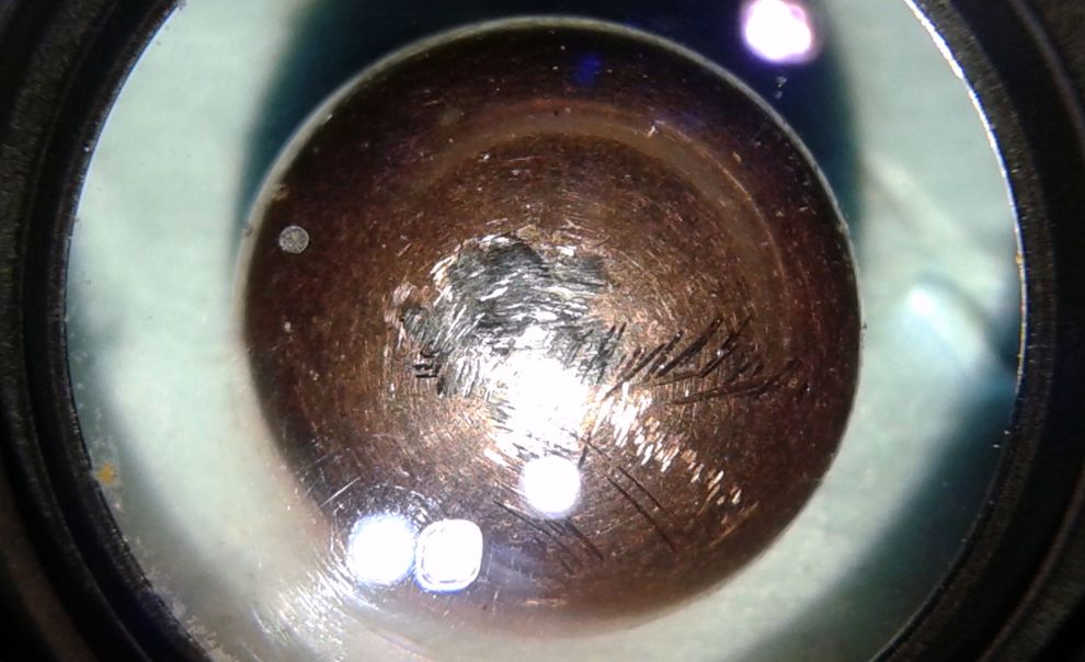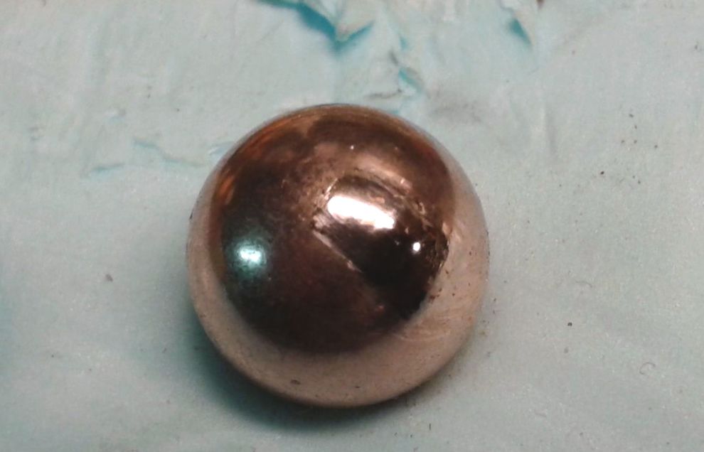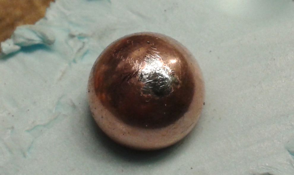 A maradék egy szem golyón, a bicskám(svájci):) élével kis darabon megkapirgáltam az amúgy puhának tűnő vörösréz réteget.