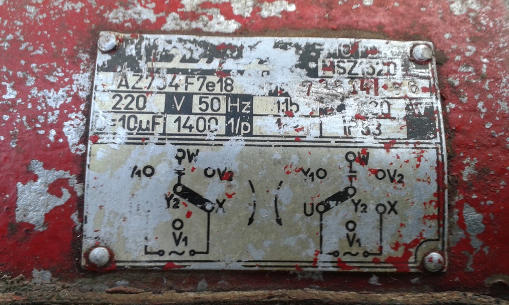 Az adattáblája szerint, Ő is 220/125V-os, egyfázisú motor, 220V-on, egy 4uF-os 300V-os állandó üzemű kondenzátorral szerelve.