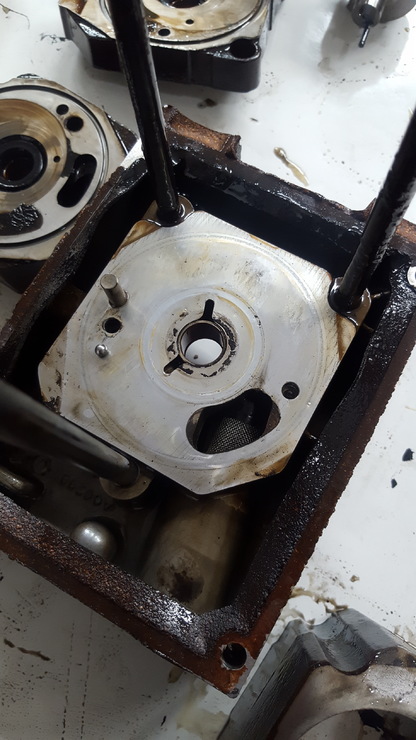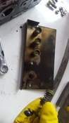 1.: legalsó lemez alulról nézve - itt valami golyós szelep is van, a levett darabból kilóg a rugó, a háttérben a golyó a neki való lyuk mellett látható (amibe beszorítja a rugó).