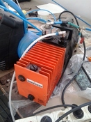 2.: A szivattyú középső alu öntvény része, ez kapcsolja össze a motort ill a szivattyú részt. Oldalt egy állító gomb, felül vákuum ill kipufogó csonkok. A kipufogó csonk gyakorlatilag közvetlenül az olajteknőbe nyílik (narancssárga bordázott darab)