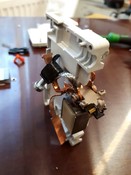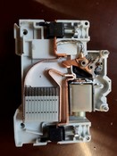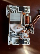 Középső műanyag két oldalára van felépítve a kioldók, jól látható  fázis oldalon a túl áramra kioldó mechanizmus ami működteti a nulla oldalt is egy kis műanyag alkatrészen keresztül. A két oldal kb 1mm vastag műanyaggal van elválasztva sehol sincs fémes kapcsolat.