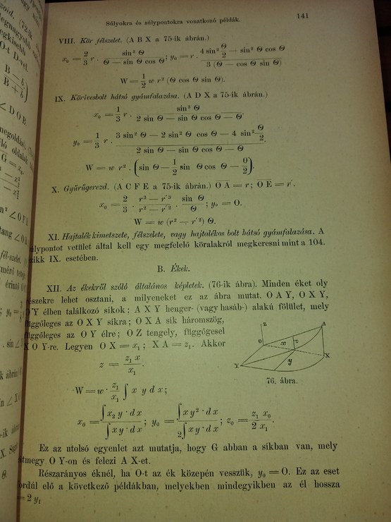 Ez itt már nagyon OFF, de még egy szösszenet. Itt egy oldal a könyvemből. Tele szögfüggvénnyel, integrállal. Mindez 1888-ból, amikor talán még a logarléc is ritkaság volt. Szögfüggvény csak táblázatokból. Nem irigylem az akkori mérnököket. Ami a könyvben külön tetszik azok a szakkifejezések. Pl. a boltívet (mint az oldal alján is látszik) "hajtalék"-nak nevezi, de sok olyan kifejezés is van benne, ami ma már megmosolyogtat illetve eltűnt az idők homályában.