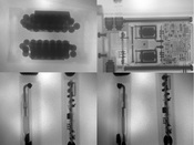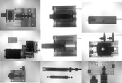 A masodik képen a pneumatikus szelepek, kisebb-nagyobb munkahengerek röntgenfelvétele van. A munkahenger oldalára szerelt reed elvű pozícióérzékelő is látható. Jobb fent egy precíziós mikrokapcsoló, tapintó látható, a benne rugóval előfeszített aranyozott golyóval, kivezetésekkel.