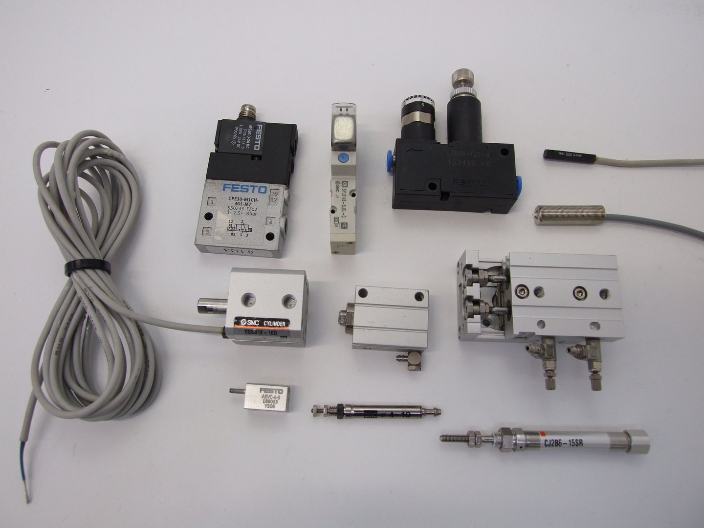 A harmadik képen egy recirkulatív golyóscsapágyas "hüvely", ami kör keresztmetszetű rúdon fut, egy feszültségvezérelt pneumatikus nyomásszabályzó, az alsó részén a múlt és jelen érzékelői között lévő eltérést szemléltetném: egy reed relés  vs. hall félvezetős, led visszajelzős munkahenger pozíció érzékelő. Kellőképpen ránagyítva a Led visszajelző és Hall traduktor szilícium lapkájának arany huzalozása (bondolása) is látható.