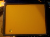 Mustársárga üveg-szerű lap, a másik felén valami öntapadós ezüst fólia, a sarkán 4 pici csavar.
