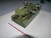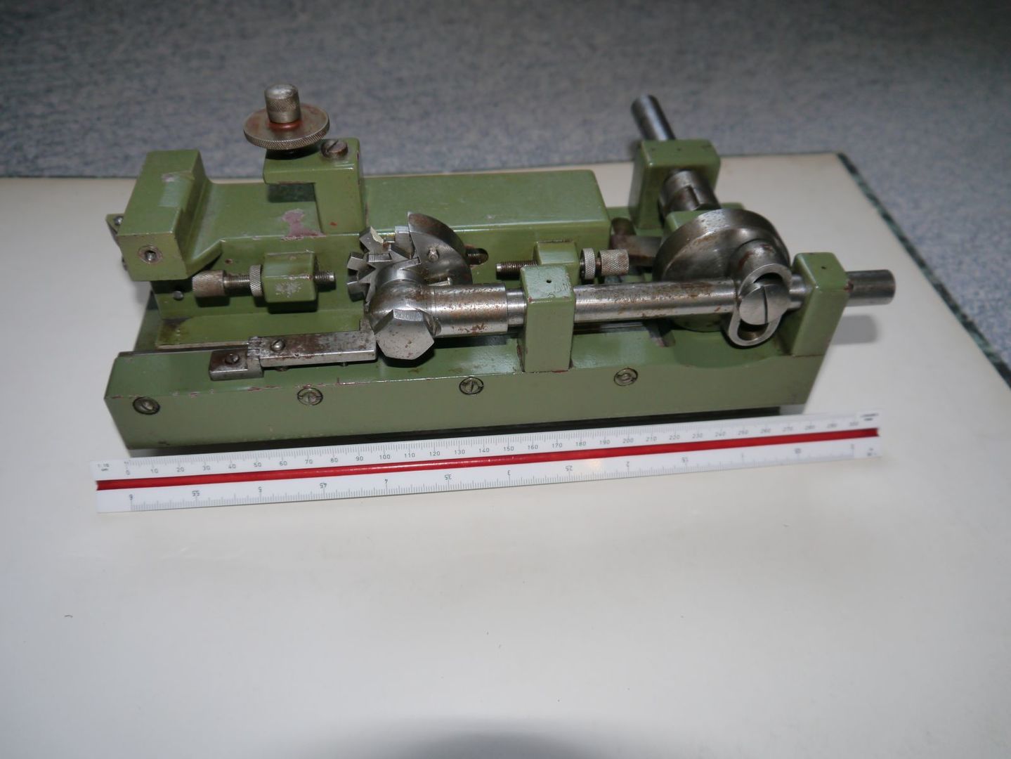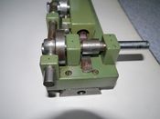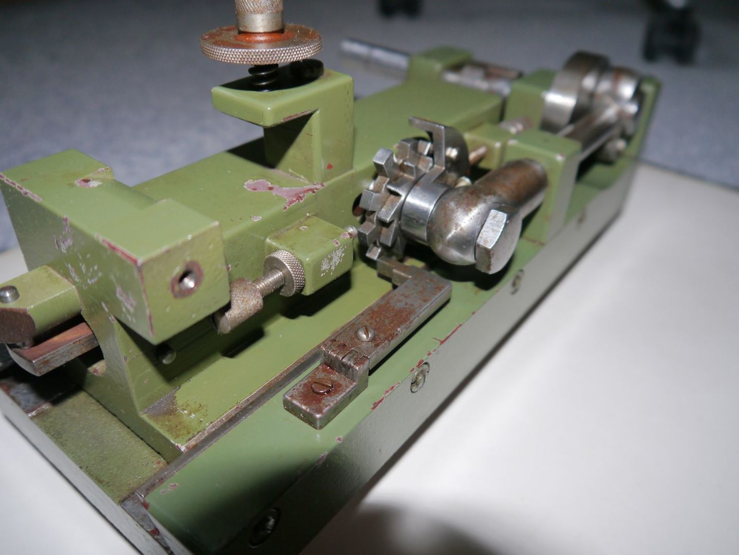 A lényeg, amiért hozzám került, az a középső, hasáb alakú "kos", ami egy nagyon precízen megmunkált, hántolt fecskefarkú vezetékben mozog. Ez a kos végzett egy érdekes alternáló mozgást a jobb felső sarokban látható tengely révén, amit egy kis csigahajtómű forgatott.